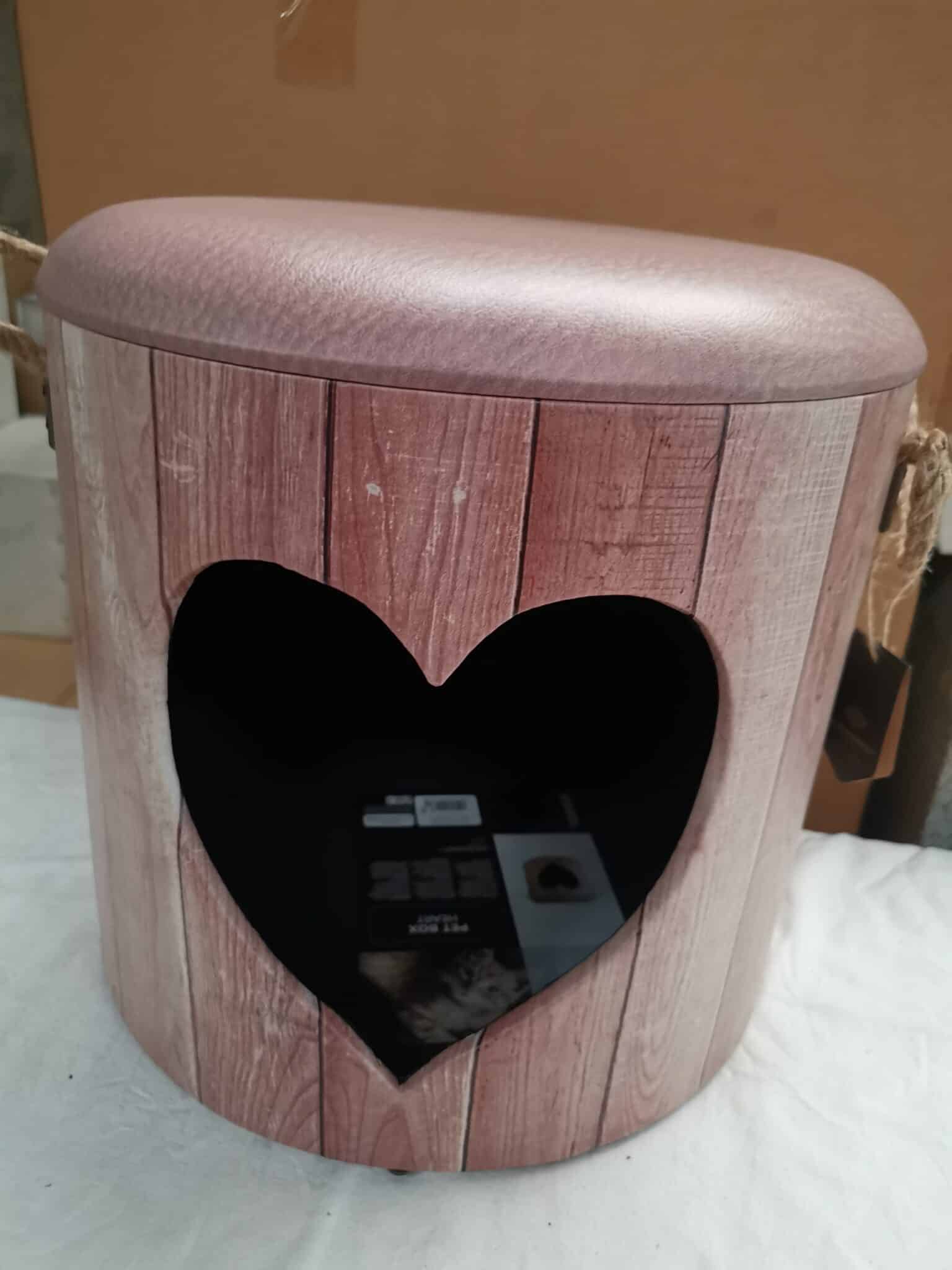 Cette magnifique boîte Heart de D&D est un abri amusant pour votre animal de compagnie, mais aussi un pouf confortable pour vous et votre animal domestique. Les panneaux en MDF résistant présentent de jolies finitions et sont recouverts de cuir PU. Les poignées rustiques sont fabriquées en corde résistante tandis que le pouf présente une jolie entrée en forme de cœur. Cette boîte convient pour les chats et les races de chien de petite taille.